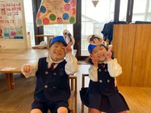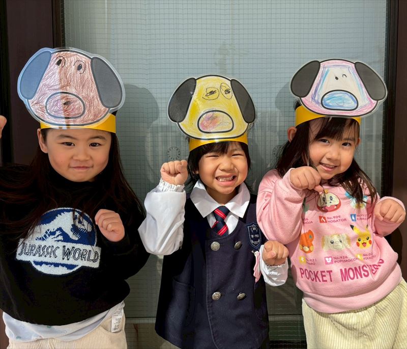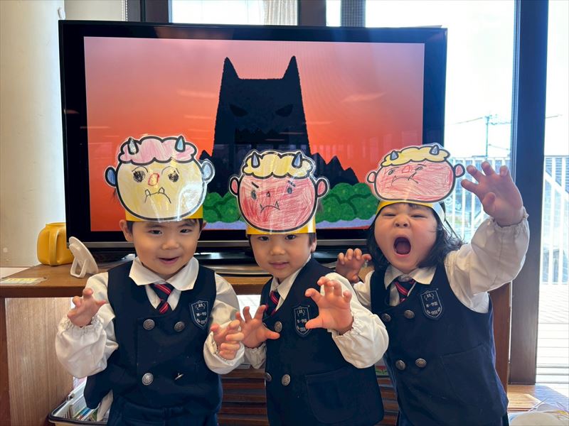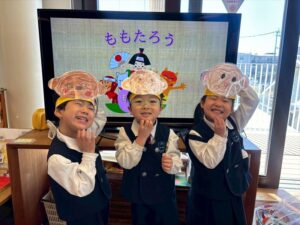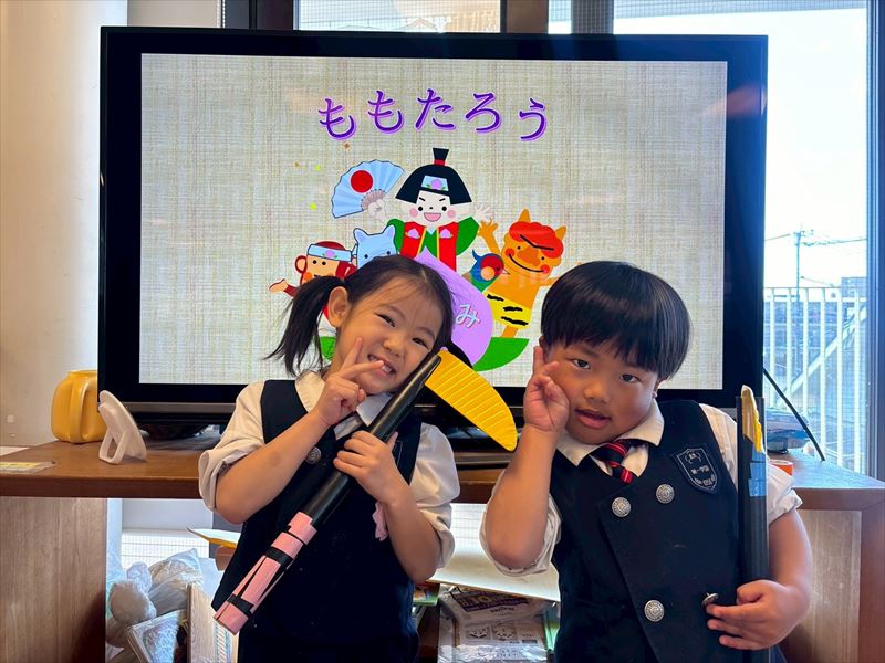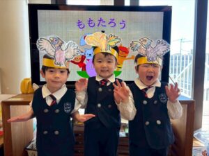 もも クラスページTOP Twitter Facebook はてブ Pocket LINE コピー 2026.02.25 もも ~自分の思いを伝え、友だちの思いを受け入れながら、共通のイメージを膨らませる~ この時期のこどもたちは、様々な言葉を駆使し、自分なりの考えや思いを『言葉』で表現することが巧みになっていきます。幼稚園では、相手の表情を自分なりに読み取り、周囲の友だちの力をかりながら、“どうやったらわかってもらえるか”を一生懸命考えながら、自分なりに筋道を立てて伝えようとする場面にたくさん出会います。ただ、言葉が巧みになってきても、自分の生活体験や表現から相手の思いや考えをイメージするのが難しいこともあり、ちょっとしたすれ違いからのいざこざも増えていきます。そういった時には『ロールプレイ』を取り入れ、“クラスの考え事”としてみんなで考え、それそれが、自分の考えを整理し相手に筋道立てて(『文』として)伝えることを学び続けているところです。 そういったこどもたちの育ちをうけ、参観では、以下の内容をねらいとしました。【ねらい】・物語や役のイメージ・登場人物の気持ちを友だちと共有し、表現することを楽しむ・言葉にすることで、伝わることの嬉しさを感じる・教師や友だちに伝えたいことが伝わるように、“文”を意識しながら話す・劇遊びを通じて色々な伝え方があることを知る 題材は、イメージを共有しやすいよう、これまで読んできた絵本の中でこどもたちが好きだったり、たくさんの“思い”を話していた印象深いものです。・ひまわり組:『3匹のこぶた(イギリス民話 訳/頼田卓二 絵/山田三郎 出版社/福音館書店)』を楽しむ・もも組 :『ももたろう(にほんむかしばなし 文/絵/いもとようこ 出版社/金の星者)』を楽しむ 絵本の世界観を楽しみながら、こどもたちなりに考えた内容が言葉や物のやり取りで表現されています。こどもたちが、それぞれの登場人物になって考えてきた過程を、どうぞご覧ください。 ももたろうにほんむかしばなし 文/絵/いもとようこ 出版社/金の星者 ページの端をタップするとめくることができます 配役 画像をタップすると拡大表示されます 桃太郎チーム1 桃太郎チーム2 おじいさんチーム おばあさんチーム おにチーム いぬチーム さるチーム きじチーム 取り組みの様子を動画でご覧ください 取り組みの様子 画像をタップすると拡大表示されます