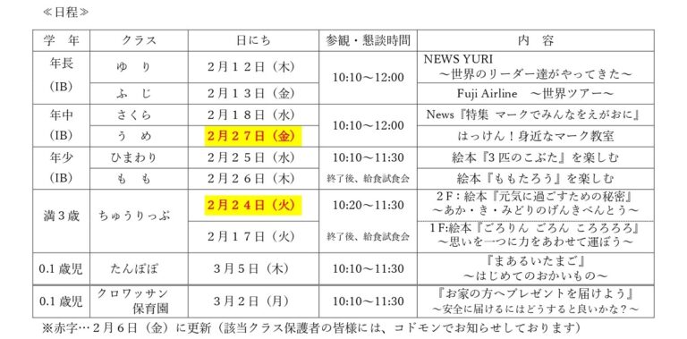 さて、成長計画案でお知らせしておりました通り、下記の日程で活動参観を行います。『言葉』を通してそれぞれの思いや考えを表現するこどもたちの成長を参観を通して感じていただける時間になればと思います。